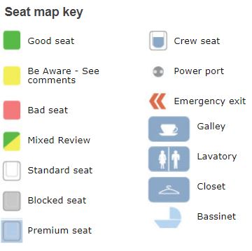 각 좌석 색상에 따라 나누어진다. - 초록색 : 좋은 좌석 - 노랑색 : 안좋은 좌석 - 두색상이 섞인 형태(Mixde Review좌석 ) : 사용자들의 반응이 각기 다름 - 색이 없는 좌석 : 일반적인 좌석 - 회색좌석(착석불가) : 여행사들에 의해 블락된 좌석으로 일반여행자용 좌석이 아님 - 파란좌석(프리미엄좌석) : 별도의 비용을 지불해야 얻을 수 있는 좌석 |