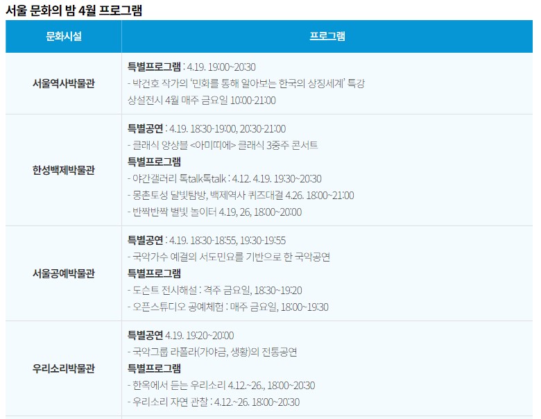 서울 문화의 밤은 매주 금요일 밤 9시까지 문화시설 개방, 특별프로그램으로 운영. 박물관이나 미술관 등 9개 시립문화시설이 참여한다고 합니다.