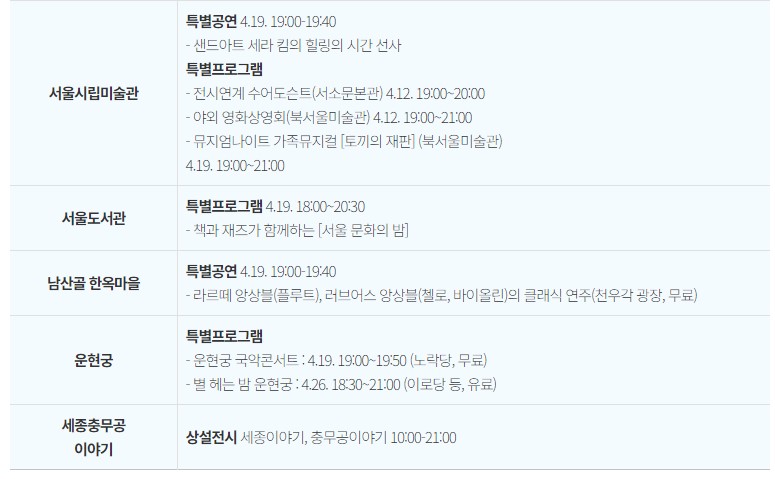 서울문화포털 누리집 > 문화정보 > 문화정책 > 일상문화 > 서울 문화의 밤 메뉴 및 각 기관 누리집에서 확인.