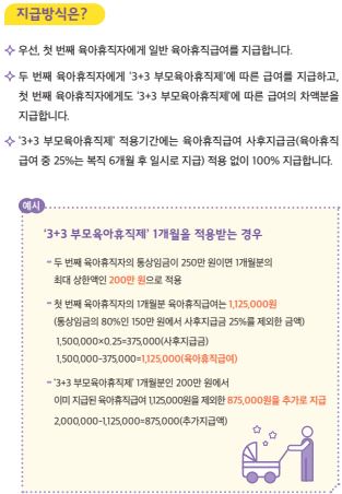 생후 12개월 내외 자녀를 돌보기 위해 부모가 육아휴직을 언제든 사용하면 육아휴직급여 중 첫 3개월은 부모에게 각각 통상임금의 100%를 지원하는 제도.