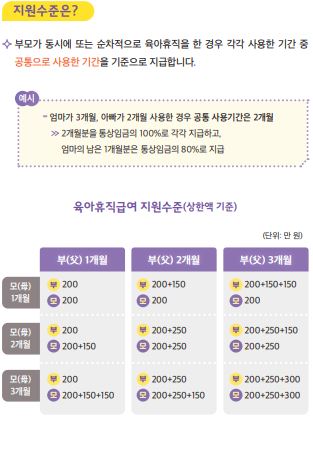 - 육아휴직 4개월째부터 육아휴직이 끝나는 날까지는 통상임금의 80%로 지원