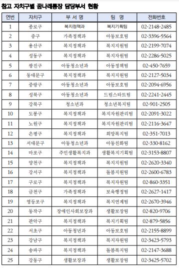 ▶ 자치구별 꿈나래 통장 담당부서 현황