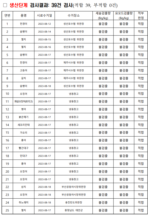 수산물 일일 방사능 검사현황