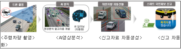 그런데 이제부터는 한국도로공사에서 드론을 활용하여 고속도로상 법규위반 행위를 AI가 자동 선별. 신고하는